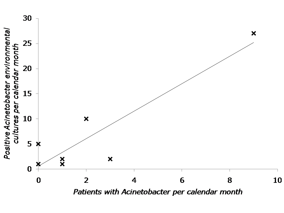 Figure 1. Correlation between the number of patients infected with Acinetobacter spp. and the number of positive Acinetobacter spp. environmental cultures per calendar month during an outbreak on a neurosurgical ICU.1
