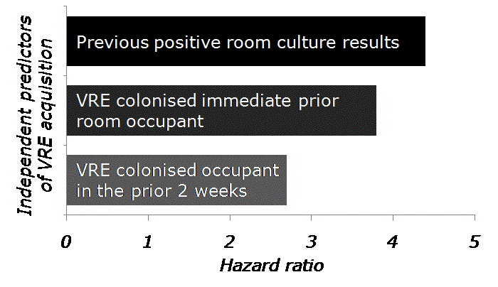 Also, one of the studies demonstrating that admission to a room previously occupied by a patient with VRE increases the chances of VRE acquisition identified something amounting to a ‘dose response’.5 The greatest increased risk was for patients admitted to a room with an environmental culture positive for VRE, and being admitted to a room where the immediate prior room occupant was colonized with VRE carried a greater increased risk than being admitted to a room where any patient in the 2 weeks prior to admission was VRE colonized (Figure 4).