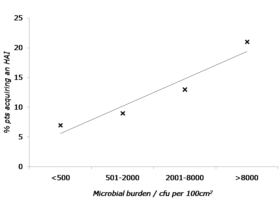 I would agree that there is a direct correlation between the level of contamination found within the environment and propensity for cross contamination to healthcare workers hands. Patient environments such as a neurosurgical ICU with long term stay patients present a significant challenge to domestic / environmental services to deliver adequate decontamination both in daily and discharge cleaning practices. Open plan ICU facilities often preclude the use of area decontamination methods to supplement manual cleaning.