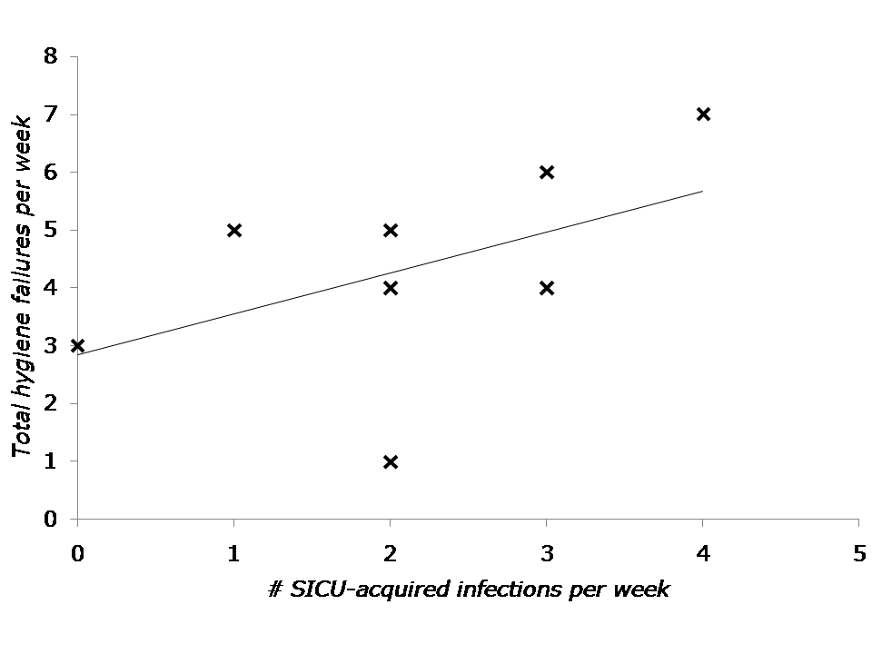 Figure 3. Correlation between the number of hygiene failures and the number of patients who acquired an infection on a surgical intensive care unit each week.3