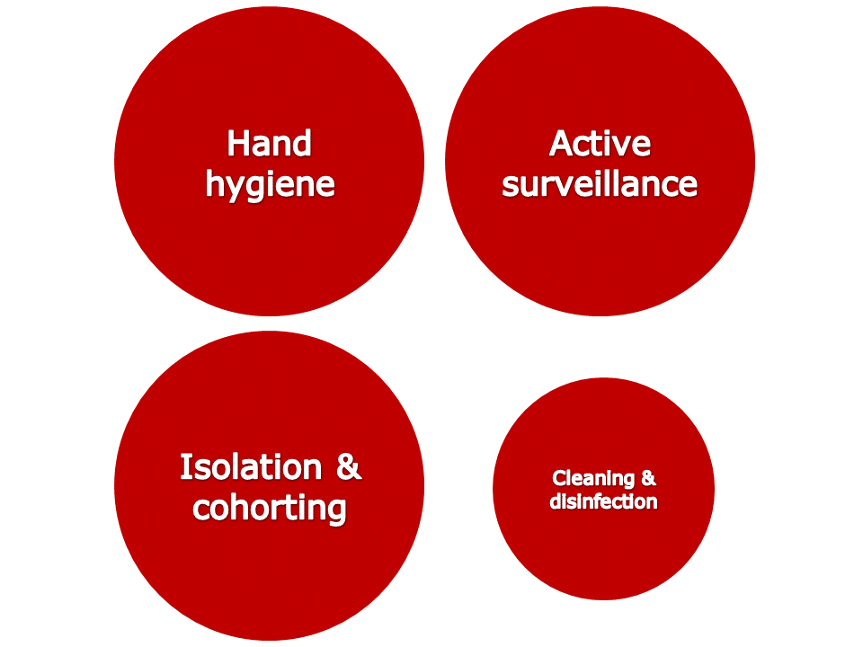 - enhanced contact precautions for all infected or colonized patients (patients only to leave room for medical reasons, visitors to wear gloves and gowns, staff not to touch personal electronic devices, preferable use of single-use equipment and enhanced terminal disinfection);