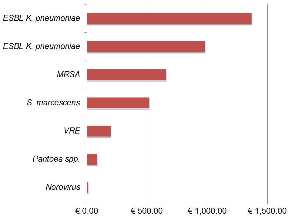 One of the most useful outcomes of the study was an ‘average cost per positive patient per outbreak day’. Although the Serratia sp. outbreak was the most expensive overall, the two separate ESBL-producing K. pneumoniae outbreaks were the most expensive on a per day basis. So, if they had gone on for much longer, they would have quickly overtaken the Serratia sp. outbreak as the most expensive overall. Interesting to note that neither of the K. pneumoniae outbreaks were in the ICU, so the bed closures would have been even more costly in this setting. Having a cost per patient per outbreak day is handy, and allows easy comparision with your outbreak. Pick the most comparable pathogen / setting combination, and count how many outbreak days you have to get to a reasonable estimate of the outbreak cost.