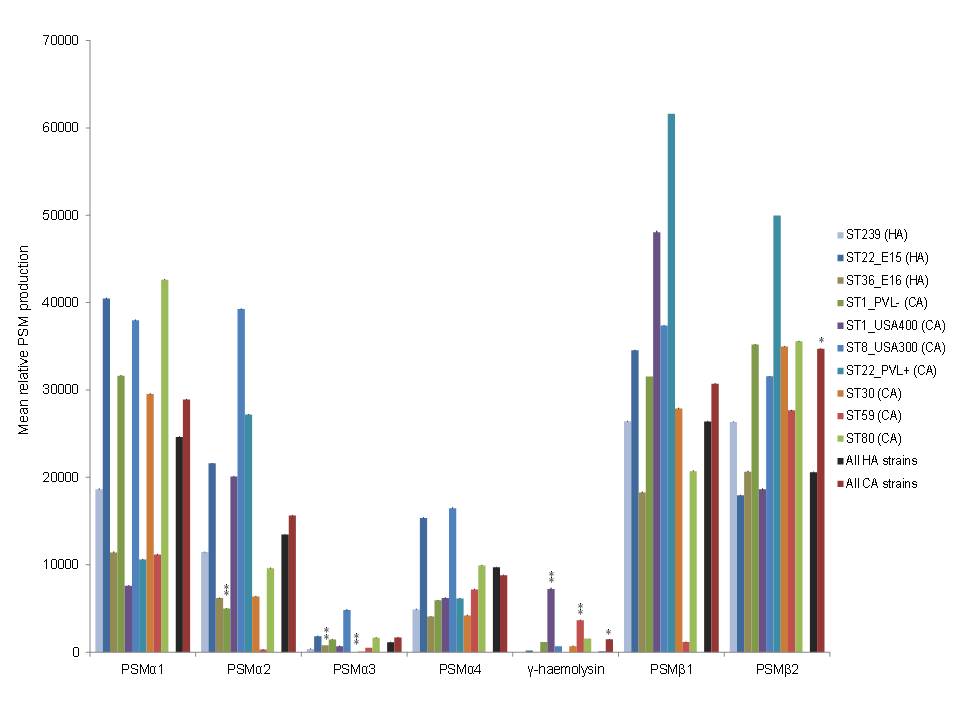Figure: Production of PSMs. The error bars represent plus one mean coefficient of variation (CV) for each data point across the replicates. * = p<0.01 for T-test comparing HA with CA strains; ** = p<0.05 in ANOVA post-hoc testing when comparing clones using ST8 (USA300) isolates as a reference.