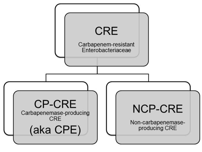 I am currently involved in some research that requires a clear distinction between CPE (i.e. Enterobacteriaceae that produce a carbapenemase) and non-carbapenemase-producing CRE. Since ‘non-carbapenemease-producing carbapenem-resistant Enterobacteriaceae’ is a bit of a mouthful, I need to come up with some sort of acronym. I would appreciate your thoughts on the scheme set out below: