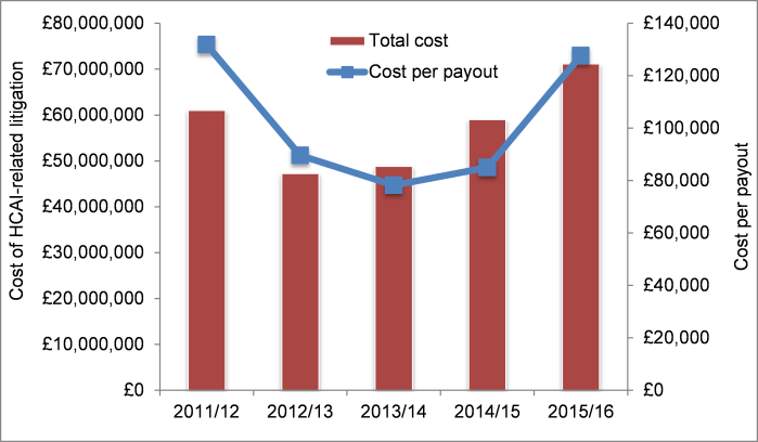 Figure 1: Trends in total HCAI-related litigation costs. These are total payments made in each financial year, which may not necessarily be linked to cases reported in the same year, and which may be include regular payments for long terms conditions related to harm.