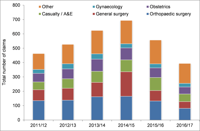 There’s an interesting trend in the total number of HCAI-related claims, which rises to peak in 2014/15, then declines to almost half the 2014/15 total in 2016/17 (Figure 2). This may be because there is a delay in the incident occurring and a claim being registered. This means that the average cost per payout is looking higher in recent years, but would reduce if the number of claims does rise (see Figure 1). Overall, the most common source of HCAI-related litigation is orthopaedics (around 30%) followed by general surgery (around 20%), then A&E (around 15%) (Figure 2). These proportions have not changed much over the past five or so years.