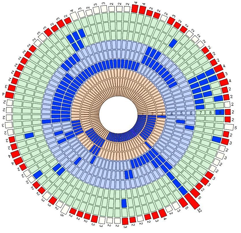 Figure 1: The nine concentric circles represent healthcare settings (i.e. inpatient; outpatient; community) for hospitals A (orange), B (blue) and C (green). The 90 transmission clusters are represented by a segment. The number of unique patients in the cluster is shown by a bar. Red and white bars correspond to transmission clusters of ST22 and other STs, respectively. For each cluster, the location of patients in the cluster at the time of sampling is shown in blue.