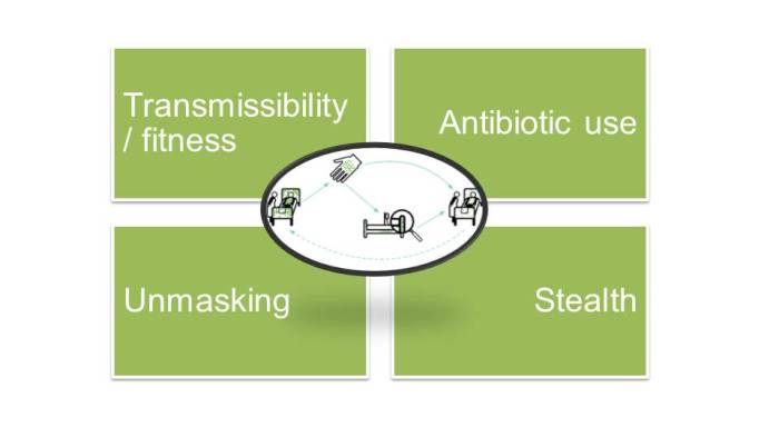 - Bacterial transmissibility / fitness. A recent study reported that Klebsiella species transmitted almost 4x more frequently than coli in a Dutch ICU setting. Why is this? Presumably because Klebsiella species are more fit to spread in the hospital setting. Is this also the case for different strains of Klebsiella species (almost certainly), and perhaps also for different carbapenemases in the same strain? Much more to learn here.