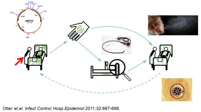 Figure 1: A summary of CPE transmission modes: hands, surfaces, medical devices for sure. But what about sinks / drains / wastewater, air, colonised staff, and plasmid spread?