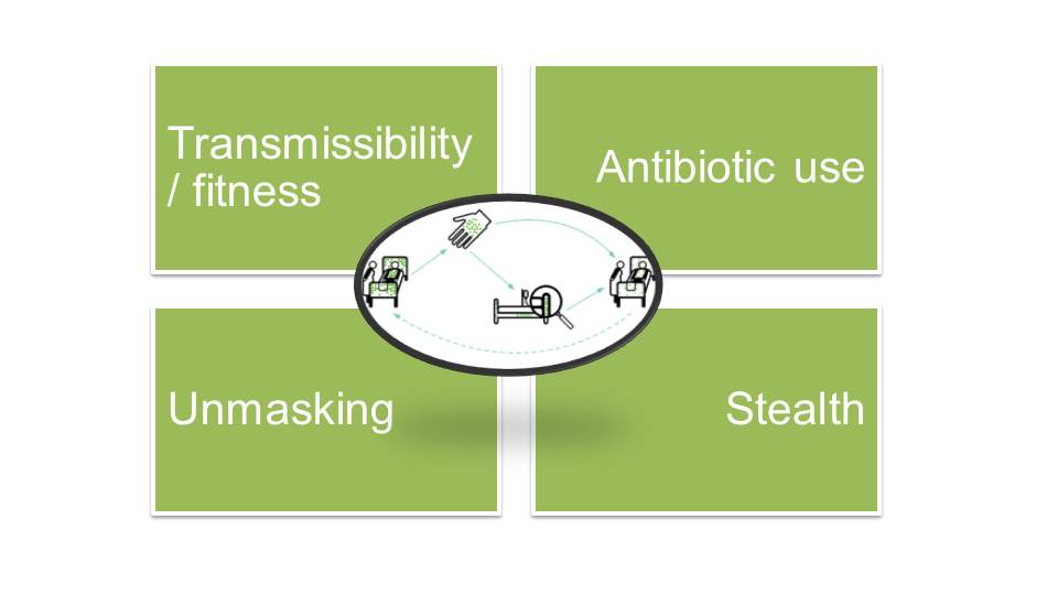 - Bacterial transmissibility / fitness. A recent study reported that Klebsiella species transmitted almost 4x more frequently than coli in a Dutch ICU setting. Why is this? Presumably because Klebsiella species are more fit to spread in the hospital setting. Is this also the case for different strains of Klebsiella species (almost certainly), and perhaps also for different carbapenemases in the same strain? Much more to learn here.
