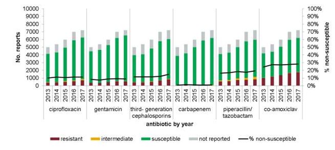 - >98% of Kleb and E. coli BSIs remain phenotypically susceptible to carbapenems, so England remains firmly in the ‘green’ in terms of ECDC heatmaps – but no room for complacency. Not least because the actual number of antibiotic resistant Gram-negative bacteria is increasing notably in proportion to the increase in all GNBSI (see Figure 1 below).