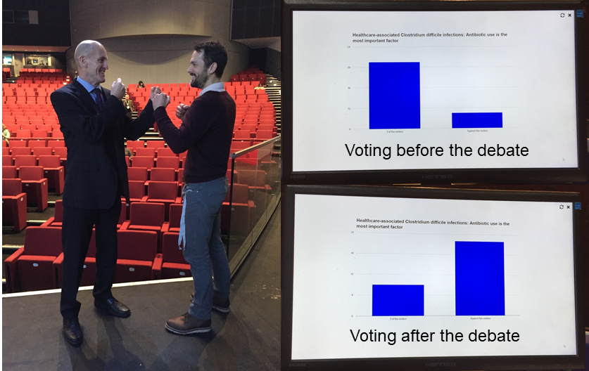 And the result? A poll of the audience before hearing the arguments found that one third votes against the motion that antibiotics are the most important factor (Figure 2). After the debate, the audience had switched allegiance and two third voted against the motion! It was fun to be a part of the debate, and I hope that it was useful in highlighting some of the issues and uncertainties around C. difficile infection and transmission dynamics in hospitals.