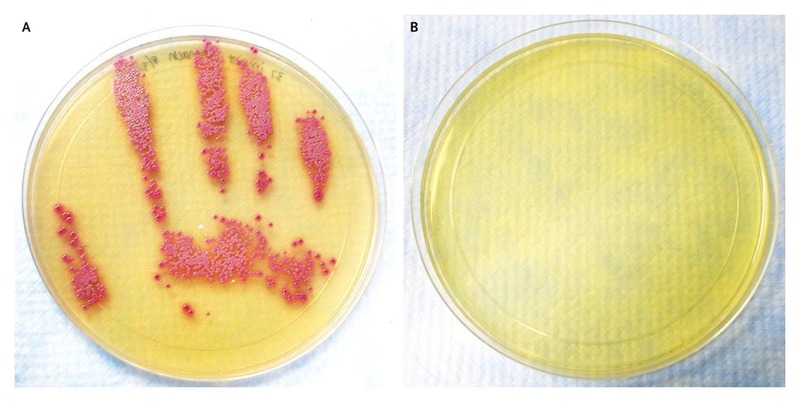 Figure: A hand print culture for MRSA following an abdominal examination of a patient colonised with MRSA before (A) and after (B) the use of an alcohol based hand hygiene product. From NEJM.