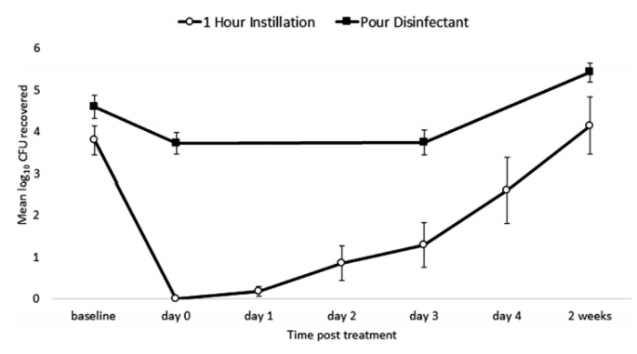 Figure: Impact of disinfecting a drain by pouring down a disinfectant vs. a 1-hour contact time using the balloon catheter on contamination with Gram-negative rods at a depth of 1 inch below the strainer.