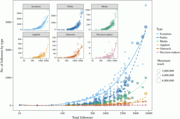 The profiles were analysed in to determine whether they were ‘inreaching’ or ‘outreaching’ (see Figure 1). The number of followers for the 110 profiles analysed ranged from 85 to 8,776, with 34 women and 76 men. Reassuringly, gender did not influence tweeting activity or the number of followers (after controlling for the number of months active on Twitter). Rather depressingly, scientists were the group with least reach on Twitter. The authors identified an inflection point at around ~1,000 followers, at which the accounts analysed had more non-scientist than scientist followers (see Figure 2).