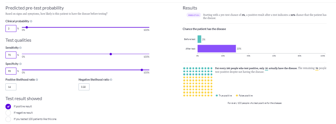 Figure 1: The probability of a PCR test returning an accurate positive result if the pre-test probability is 3%, and the assay sensitivity is 70% and specificity is 95%.
