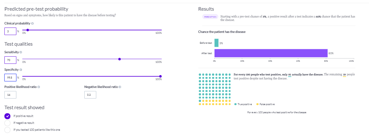 I think that in reality the specificity of the PCR assay is much better than 95%. So, let’s re-run this with a specificity of 99.5% (see Figure 2). In this scenario, it’s better but far from perfect: 81 in 100 positive results will be true positives, but you will still have 19 in 100 false positives.