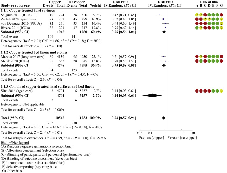 A helpful new review and meta-analysis asks whether treating hard surfaces or linen reduces healthcare-associated infections. The review identified only a small number of studies that had both a copper-related intervention related to surfaces and/or linen and an outcome related to HCAI. But the meta-analysis of the seven studies found that, overall, the risk of HCAI was reduced by 27% (risk ratio 0.73, 95% confidence interval 0.57–0.94).