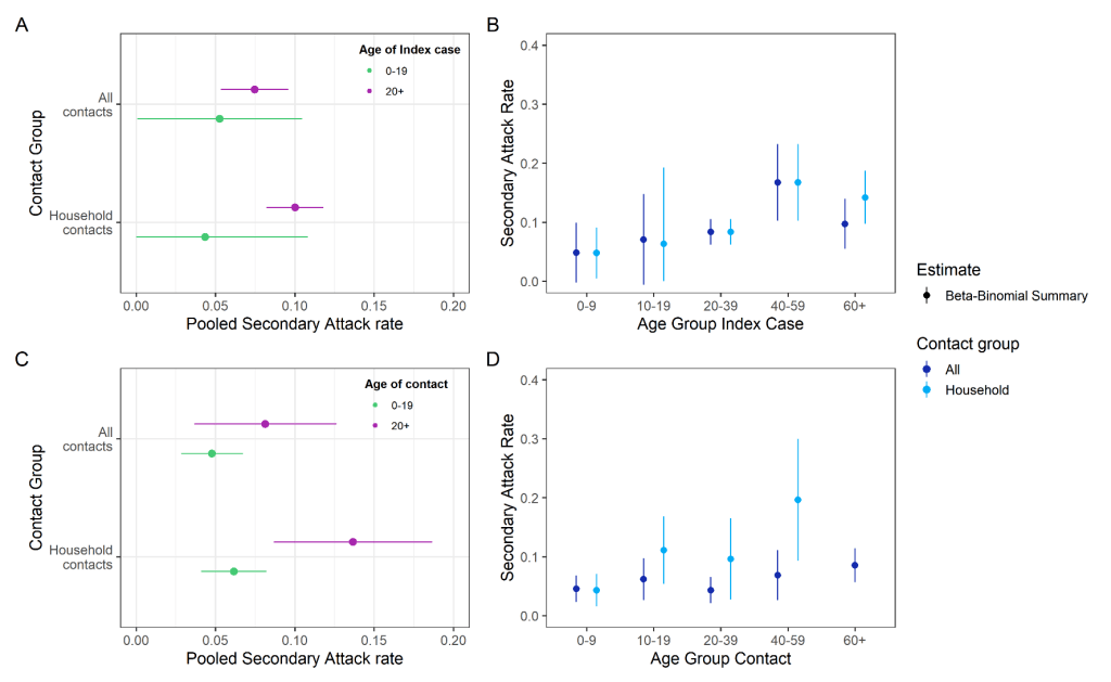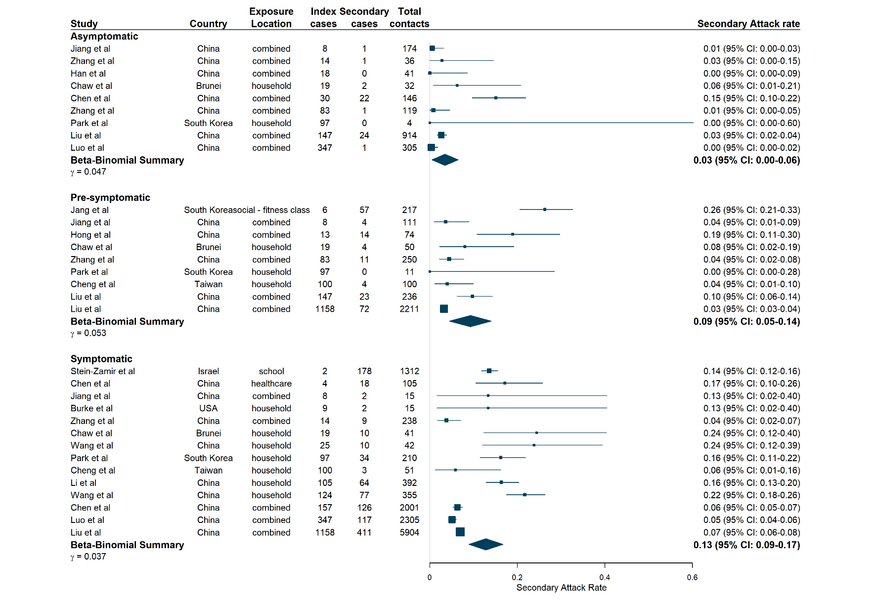 A rather beautiful review and meta-analysis by colleagues at Imperial College London examines the evidence around the secondary attack rate (SAR) for SARS-CoV-2 in various settings, highlighting the risk of prolonged contact in homes as the highest risk for transmission.
