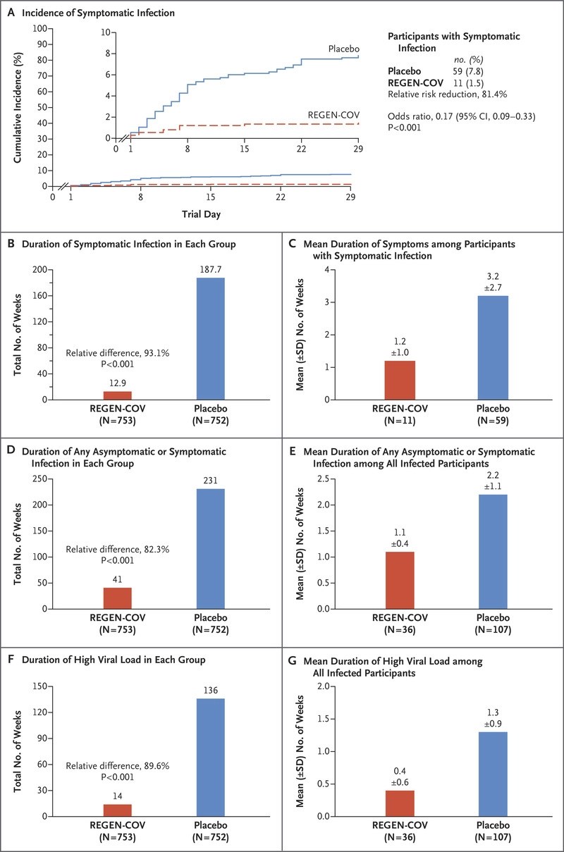 The results were nothing short of spectacular (see visual abstract and the Figure). Monoclonal antibodies dramatically reduced the rate of symptomatic infection (11 of 753 participants in the REGEN-COV group (1.5%) vs. 59 of 752 participants in the placebo group (7.8%) (relative risk reduction, 81.4%; odds ratio, 0.17; P<0.001), asymptomatic infection (36 of 753 participants in the REGEN-COV group (4.8%) vs. 107 of 752 participants in the placebo group (14.2%) (relative risk reduction, 66.4%; odds ratio, 0.31; P<0.001). Monoclonal antibodies also reduced the mean duration of infection (1.2 weeks in the REGEN-COV group vs. 2.2. weeks in placebo), and the mean duration of high viral load (0.4 weeks in the REGEN-COV group vs. 1.3 weeks in placebo). There was no increase in adverse events reported in the REGEN-COV arm – in fact, more adverse events were reported in the placebo arm.
