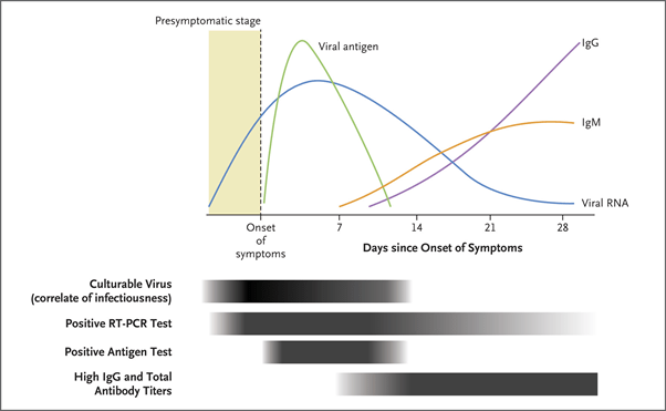 The image below from the article provides a superb overview of how levels of virus, antigen, and antibodies change over time. (PCR detects viral RNA, lateral flow tests detect viral antigen, and blood tests detect antibodies.)