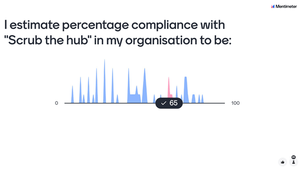 Most guidelines recommend clinically indicated replacement of PVCs as opposed to routine replacement. There is evidence that clinically indicated replacement can result in an increase in rates of complications if PVCs are not cared for when they’re in! So, I’m all for clinically indicated replacement, provided we have assurance that PVCs are being cared for. When we look at compliance with “scrubbing the hub”, compliance is very often, shall we say, sub-optimal (both in terms of doing it at all or doing it for long enough). So, we have work to do in making improvements in compliance of scrubbing the hub, and looking at other options (such as passive disinfection). The image below is a mentimeter poll that I ran during the talk, illustrating a wide range in estimated compliance with “Scrub the hub”: