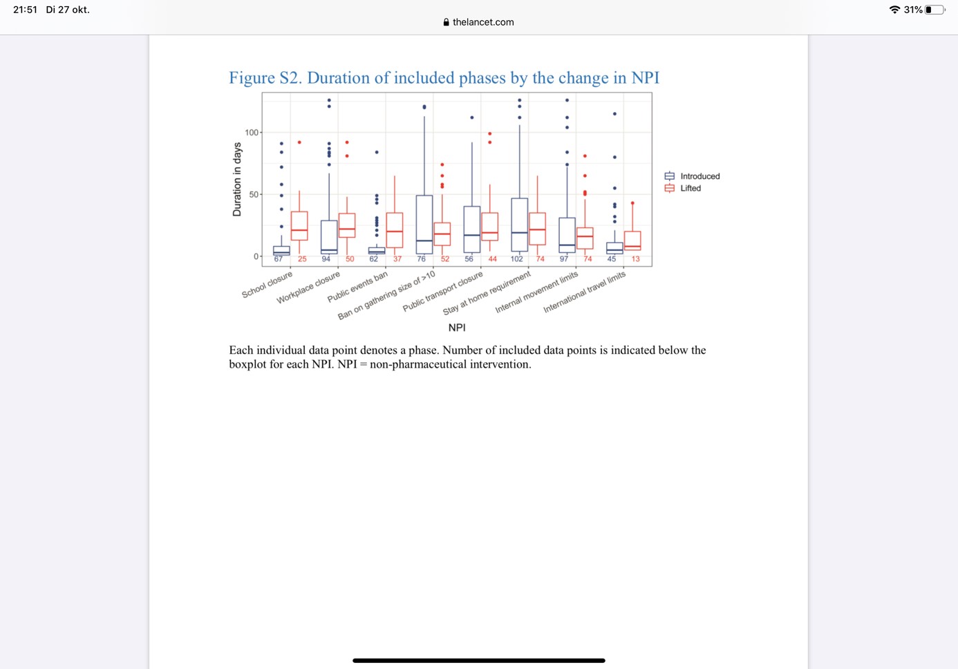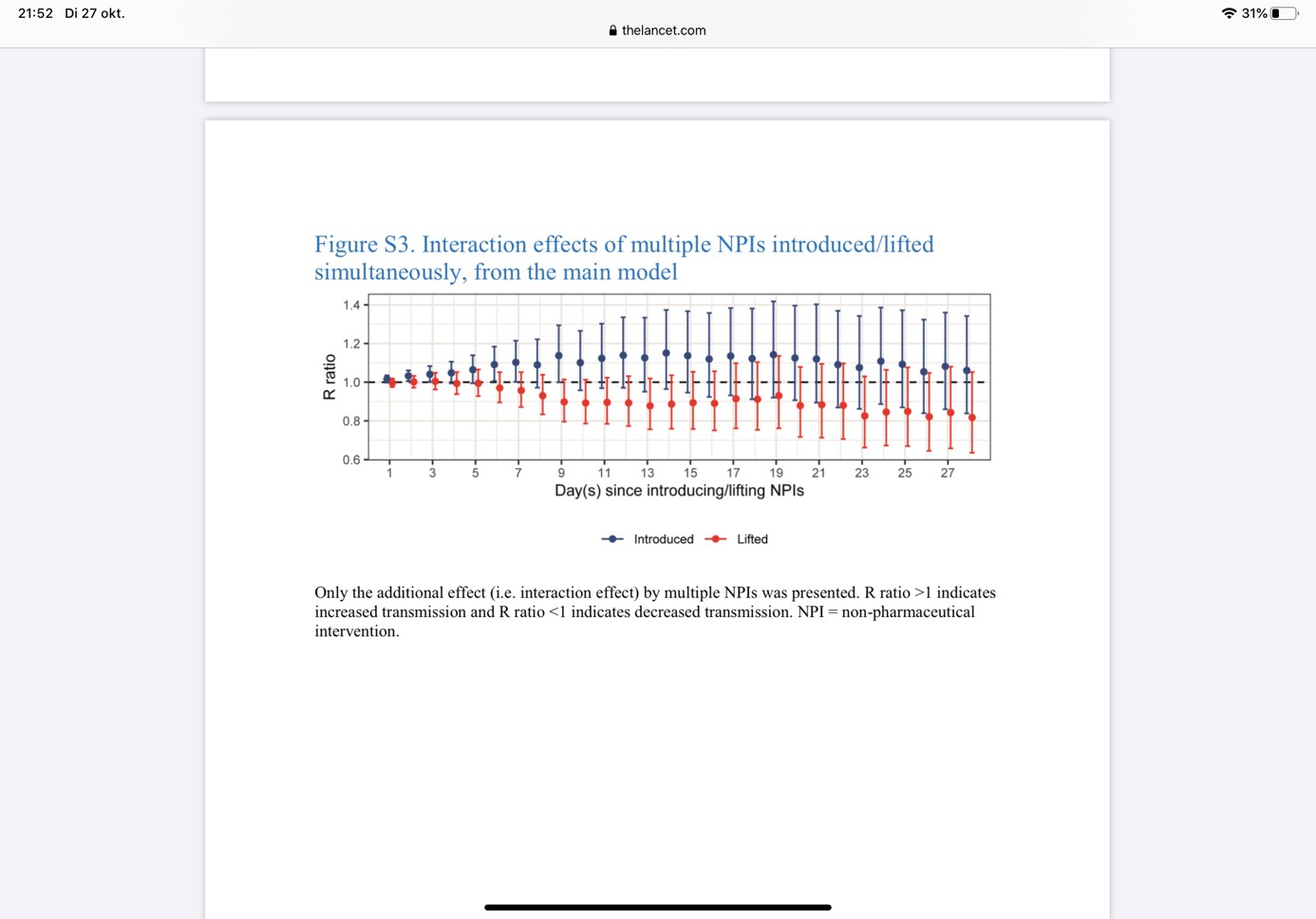 To conclude, this study provides some insight in the effectiveness of some NPIs, but precise effects of individual interventions remains uncertain and will highly depend on the prevailing Reff at the time of implementation/lifting, and other interventions implemented, lifted or maintained. The authors acknowledge some of these limitations and caution that ‘ the impact on R by future reintroduction and re-relaxation of interventions might be substantially different’. Obviously, many readers that claimed major effects of NPI, in particular of school closure, didn’t make it till this stage of the manuscript.