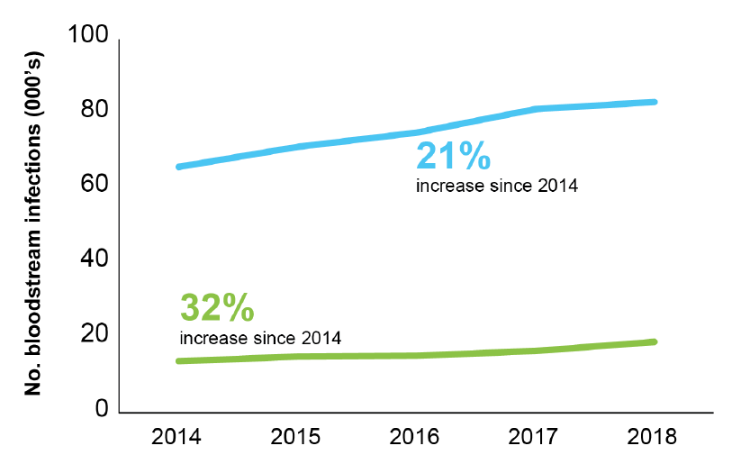 Figure: Trends in BSIs (blue line) and AMR BSIs (green line).