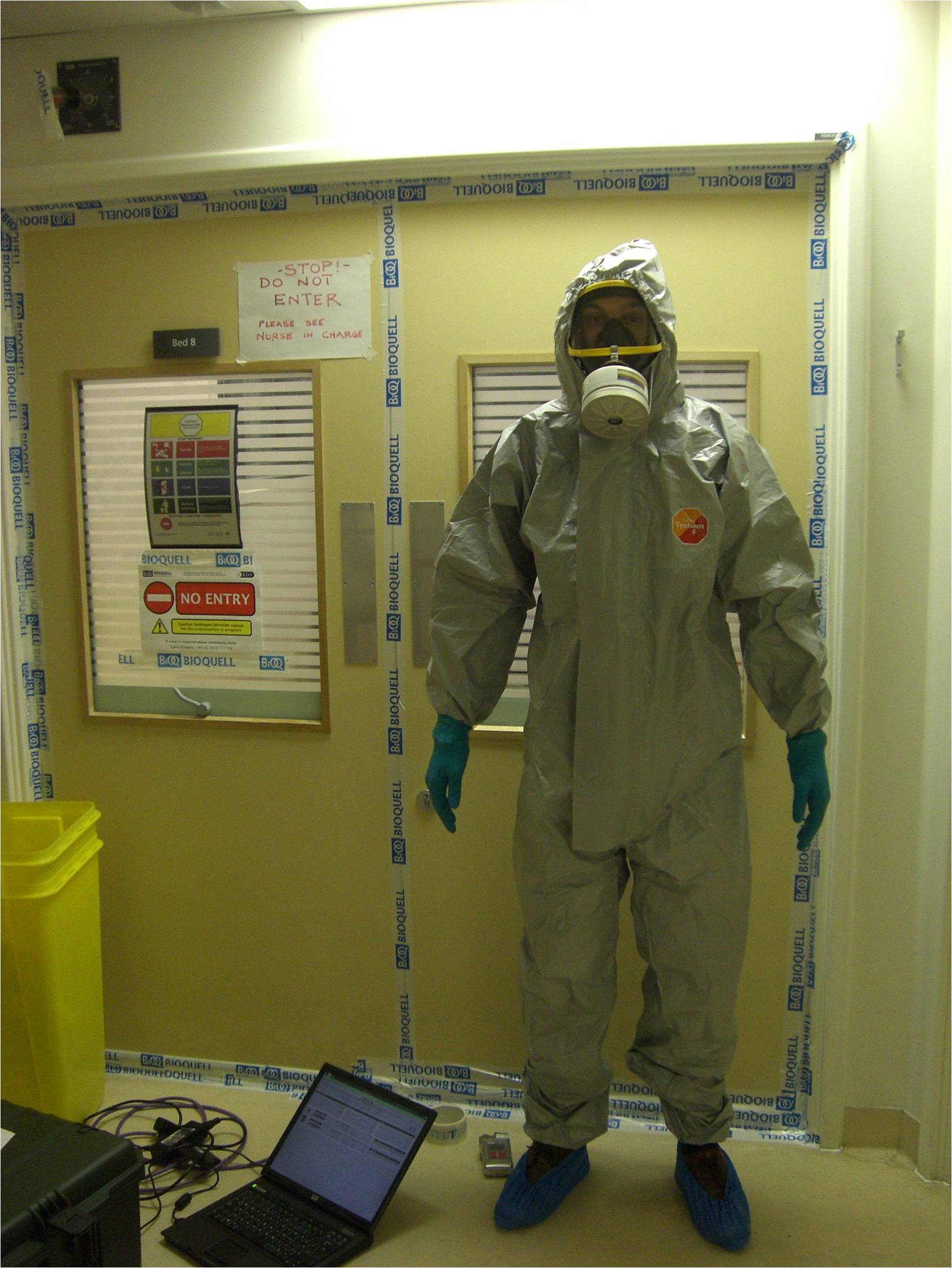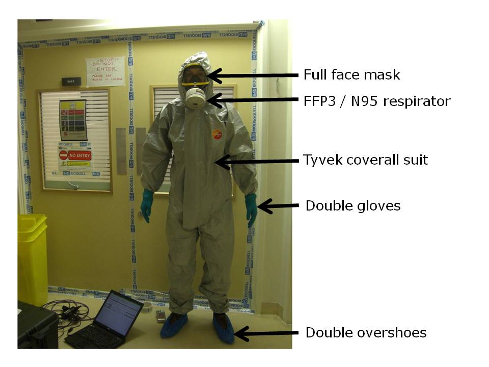 When I came to decontaminate a room using hydrogen peroxide vapour following a case of Lassa fever in London some years ago, I wore all the PPE that I could lay my hands on (see below)!
