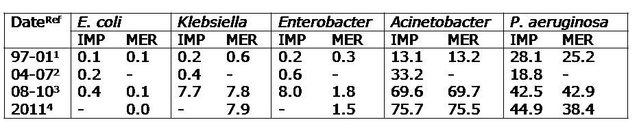 Resistance of these organisms to carbapenems has been increasing over the years, especially among Klebsiella, P. aeruginosa and Acinetobacter. The 1997-2001 SENTRY program reported on the antimicrobial resistance of 8,297 isolates of the 5 above organisms for 7 Latin American countries (Brazil, Argentina, Chile, Colombia, Mexico, Uruguay and Venezuela).1 The data found carbapenems to be effective against Enterobacteriaceae (<1% resistance level). Resistance among Acinetobacter and P. aeruginosa was around 13% and 26% respectively. In 2001, carbapenem resistance among the Enterobacteriaceae remained <1%, while resistance for Acinetobacter and P. aeruginosa rose to around 17% and 36% respectively.