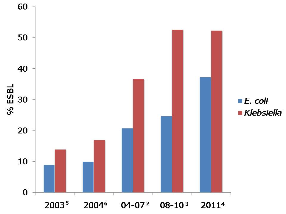 Figure. Inexorable rise in rate of of ESBL-producing E. coli and Klebsiella in Latin America.